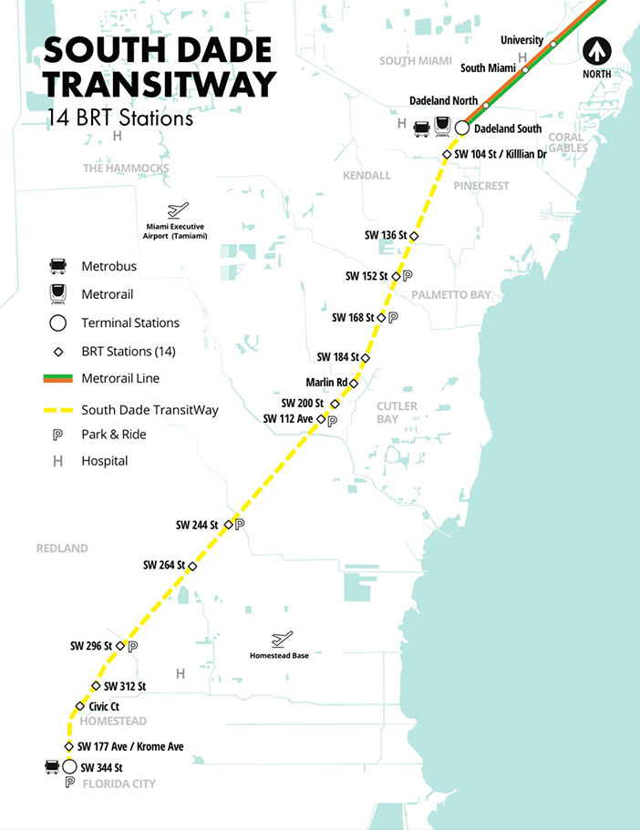El 22 de octubre se inaugura oficialmente y el día 28 entra en servicio el Corredor Sur o South Dade TransitWay, primero de esos seis corredores. Es una infraestructura viaria que se extiende a lo largo de 20 millas (32 kilómetros) en paralelo a la congestionada US Ruta 1, con carriles independientes del tráfico y 14 estaciones, que conecta Dadeland South, en el centro de la ciudad, con los municipios del sur de Miami (Pinecrest, Palmetto Bay, Cutler Bay, Homestead y Florida City). Una flota de 60 autobuses eléctricos, que reducen las emisiones contaminantes, es la encargada de dar servicio a este corredor, que tras su inauguración se ha convertido en el sistema BRT eléctrico de mayor longitud de Estados Unidos. Se estima que el servicio del denominado Metro Express reducirá en un 40% los tiempos de viaje en automóvil entre Miami City y Dadeland en horas punta.
