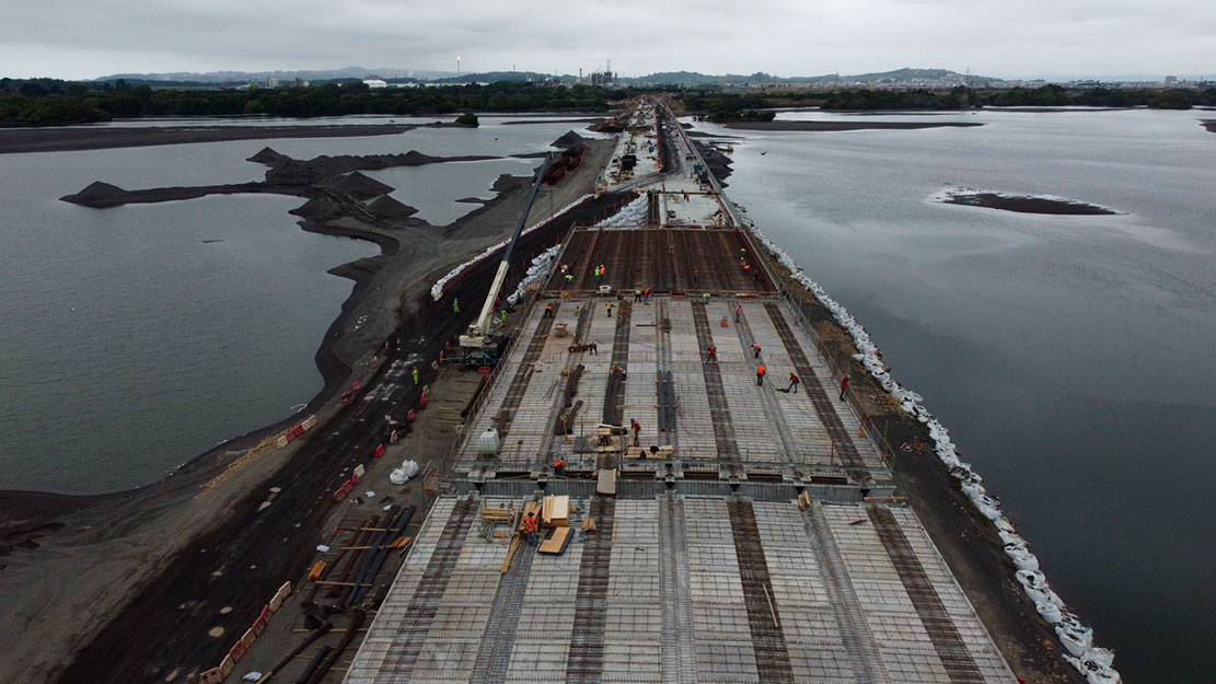 Además de los lugares de trabajo en ambas orillas, la empresa constructora habilitó una planta de fabricación de armaduras de pilotes –aplicando una solución innovadora para fabricar pilotes de acero de hasta 36 metros de longitud, en colaboración con la empresa española ERSI– y una planta de prefabricados para vigas, con objeto de reducir los plazos de la obra. La ubicación de esta última, a 20 kilómetros de la obra, lo que obligó a que el traslado de estas vigas se realizara por medio de camiones especiales en horario nocturno. En todos los trabajos se ha empleado maquinaria especializada, desde las pilotadoras para la ejecución de pilotes, con tecnología computerizada, hasta dos grúas móviles de gran capacidad, con una capacidad de levante conjunta de 70 toneladas, utilizadas en tándem para el izado y colocación de las vigas.