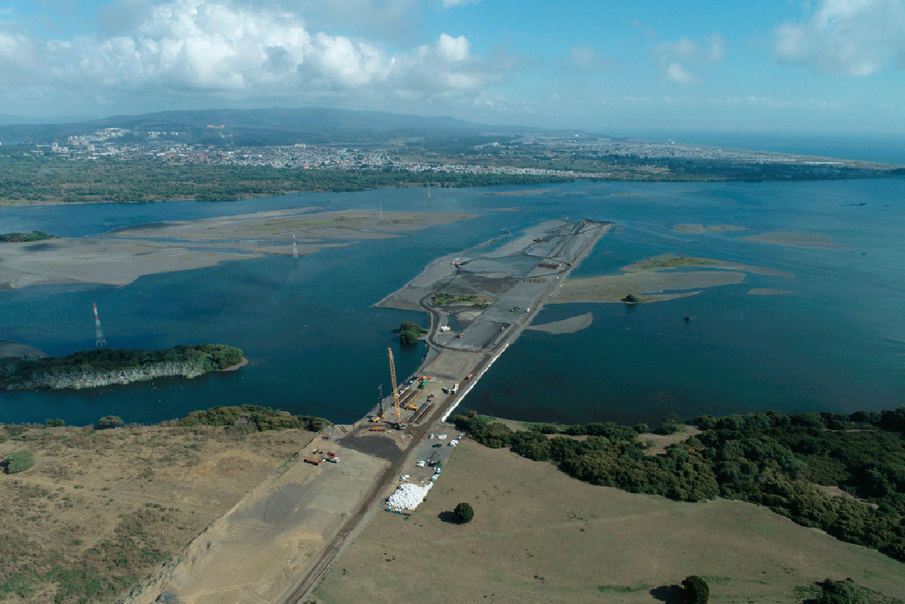 La ejecución del puente principal, cuyos trabajos se iniciaron en la ribera norte, ha estado condicionada por numerosos factores. Para los trabajos de pilotaje hubo que habilitar temporalmente penínsulas artificiales en el río, que, a modo de plataforma de trabajo (45 metros de anchura y 2,5 metros de altura), permitieron la instalación de los pilotes y el izado de vigas en seco. Para ello se ha movido un volumen de material superior a 100.000 m2 extraído del cauce del río. Al término de la obra, las penínsulas se suprimieron, devolviendo al río el material removido y quedando de forma permanente solo la base de pilotes. Además, en los sectores A y C se realizaron trabajos de mejoramiento de suelos mediante compactación dinámica, que requirieron el empleo de técnicas y maquinaria especiales.